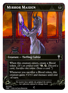 Acid Spray got some gripes for being too swingy, thanks to its flexibility and the permanence of -1/-1 counters. However, after exploring potential nerfs, I found that any changes would either remove its identity in the set, or make it too weak. Ultimately, I think it’s important to have a strong removal option that can take out one mid-sized threat or keep this set’s many small token creatures in check. As a compromise, it will now become an Uncommon spell so it doesn’t show up as often in limited. In its place, Mirror Maiden can return to the Common slot! A few testers said they were excited to see more Blood tokens in future games.