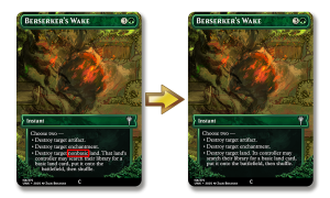 I never gave much thought to the land destruction aspect of Berserker’s Wake, since in my mind the artifact/enchantment hate would almost always be more relevant. However, during one test, a player pointed out a problem: it was very easy for this card to get stuck in hand because it didn’t have two valid targets, even if there was a problem artifact or enchantment in play! By letting it target any land, this will almost never be the case when it matters most, while still letting it blow up a Tower of Secrets or tri-land now and then.