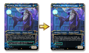 Mesmir was the last piece of an old, experimental “shuffling matters” package. I’ve learned that shuffling your library isn’t something to encourage, especially in person. It’s annoying and time-consuming, and so should only be done when necessary to maintain the randomness of upcoming cards. As cute as it was for Mesmir to reduce the randomness of those shuffles by letting you scry 3 each time, this wasn’t easy to trigger in practice outside of generic cards like Illusory Palace. By changing this effect to a simple tap ability, it’s much easier to use and still maintains his divination identity, while helping you dig to find any cards that were shuffled back in by his ETB.