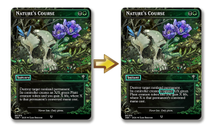 Nature’s Course is a gorgeous card, but hasn’t quite found its niche as removal. It can destroy nearly anything (and gain some life to boot), but the tradeoff of replacing it with a Plant token made it too awkward to use most of the time. In practice, this meant it was only really good at removing something with a powerful ability, and in some cases players even pointed it at their own understatted permanents to “trade up” into a larger board presence.