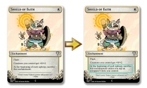 This likely won’t happen often, but it opens the door for a Cleric-heavy White deck to enable the permanent Shield of Faith dream. By devoting two Clerics to tap each turn, it can stick around indefinitely, and I could see this being worthwhile in a “toughness matters” deck built around Zaba Ditka!