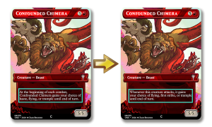 Confounded Chimera has been a solid curve-topper for red, but something felt off about its ability to choose one of three keywords each combat. Haste only ever mattered the turn it was played, and if it was blocking, flying became the only relevant option. Additionally, the fact that the ability technically triggers even if the Chimera is already tapped feels awkward.