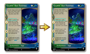 Another sleeper hit of the UWK, Giants’ Day Festival bundles card advantage and mana acceleration all in one. However, after putting together a grave-themed cube of real MtG cards (https://cubecobra.com/cube/list/boguckibog, if you’re curious!), I’ve learned that I was underestimating the power of self-mill. Bumping this one down slightly so it only mills four at the start, giving you slightly less choice of what to return to hand. I still expect this Saga to be a reason to play Blue/Green, and a premium ramp option.