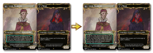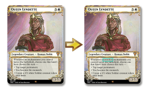 I’m changing him back to needing to tap for his effect, slowing the whole thing down by a turn and giving opponents a window to respond. In addition, he now exiles himself and returns transformed, at least letting him block that turn. But more importantly, it removes any Equipment or Auras he might have attached to him before he gets permanent shroud. This never came up in testing, but it should remove a potential angle of cheese when paired with something like Unbreakable Bolt.