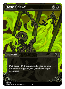 Acid Spray got some gripes for being too swingy, thanks to its flexibility and the permanence of -1/-1 counters. However, after exploring potential nerfs, I found that any changes would either remove its identity in the set, or make it too weak. Ultimately, I think it’s important to have a strong removal option that can take out one mid-sized threat or keep this set’s many small token creatures in check. As a compromise, it will now become an Uncommon spell so it doesn’t show up as often in limited. In its place, Mirror Maiden can return to the Common slot! A few testers said they were excited to see more Blood tokens in future games.